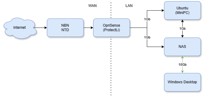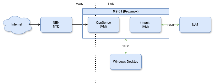 The biggest challenge I had in the Proxmox migration had to do with network interfaces. The MS-01 has 4 NICs built in and two spots for high speed USB-C based NICs. I ended up opting for all 6 NICs being used in the end. 2x 10GBe are used for a fabric between my NAS, Ubuntu VM, and Windows editing desktop. 2x 2.5GBe are used for Proxmox Management and the Ubuntu VM. 2x 5GBe USB-C NICs are used for Opnsense WAN and LAN.
