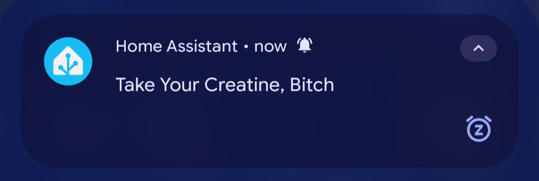 If you haven’t taken creatine before, it requires either an unpleasant loading phase (over a week) or a month of getting the creatine built up in your system. Forgetting to take it for a day is a major setback, so I devised a way to easier have HA send me a push notification daily if I forget to take my daily dose.